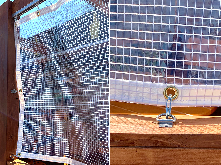 風にあおられないように側面と下部にグランドフックとワンタッチフックで固定出来るようにしています。ワンタッチで脱着可能となっています。