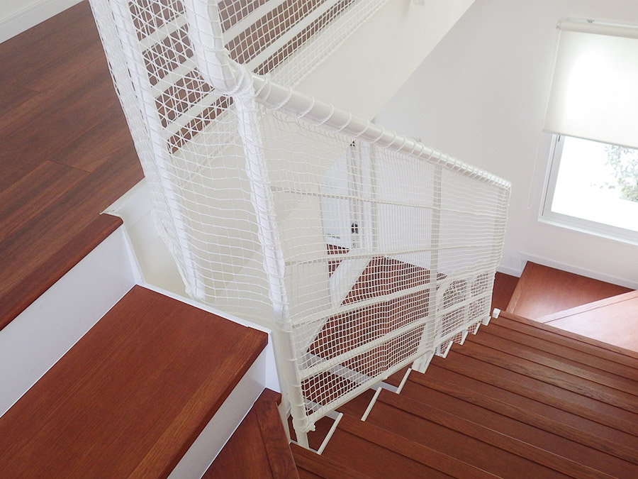 新築戸建住宅で人気のオープン階段(スケルトン階段)や吹き抜けの手すりに、転落防止・落下防止の安全対策として、階段ネットを施工させていただきました。